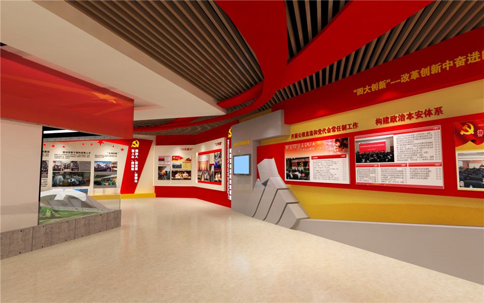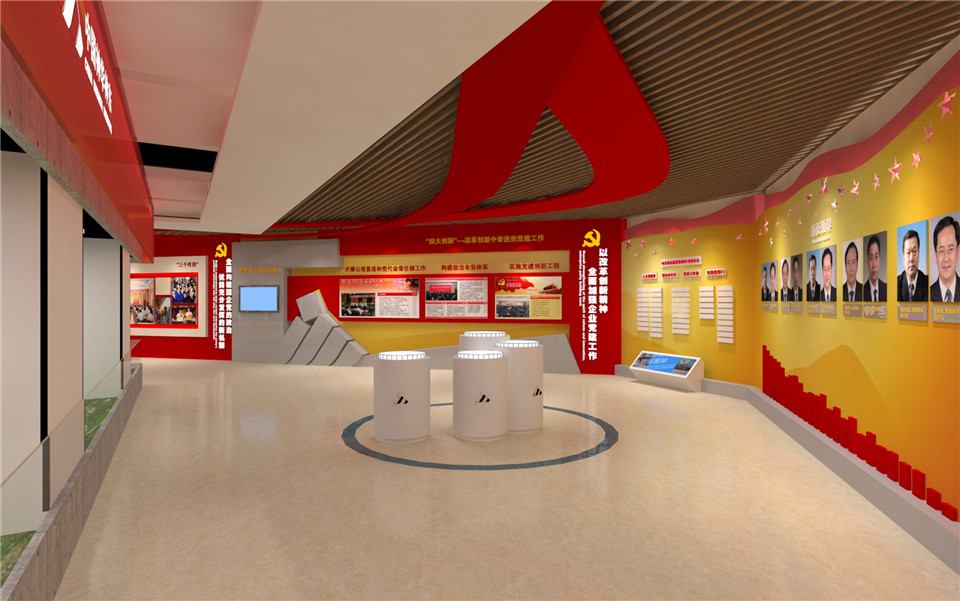 工业集团党建展厅建设用来展示总结交流党建工作成果和争创一流党建文化的工作。党建展厅建设项目主要分为党组织历史沿革及现状。以改革创新精神,全面加强企业党建文化的工作。展示实施的党建创新工程。展示了抓融入、促发展、惠群众、聚人心、保和谐。坚持深入持久开展创先争优的活动。大红色是必备色,然后是展厅设计的形状和参观顺序,红色、金色这些都可以作为我们的主题使用,主要是根据我国红色文化的背景色和LOGO颜色进行选取的。